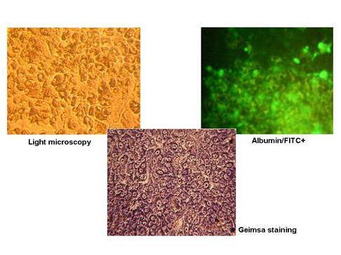 Ранние предшественники гепатического ряда исследуются на модели фетальной печени человека. Существует ряд работ, свидетельствующих об участии гепатических клеток-предшественников в регуляции гемопоэза, особенно на ранних стадиях развития. В частности, установлено, что клетки гепатического ростка фетальной печени секретируют эритропоэтин (EPO) и тромбопоэтин (TPO) и способствуют развитию эритроидных и миелоидных колоний in vitro. Кроме того, гепатические клетки фетальной печени представляют собой уникальный пул ранних предшественников гепатоцитов и холангиоцитов. В отделе разработаны методы выделения и культивирования гепатических клеток из фетальной печени человека. Так, при монослойном культивировании в средах, содержавших специфические добавки, удалось выделить эпителиоподобные клетки, способные экспрессировать альбумин (рисунок). Данный пул клеток исследуется в отделе на различных моделях патологий печени в условиях in vivo.